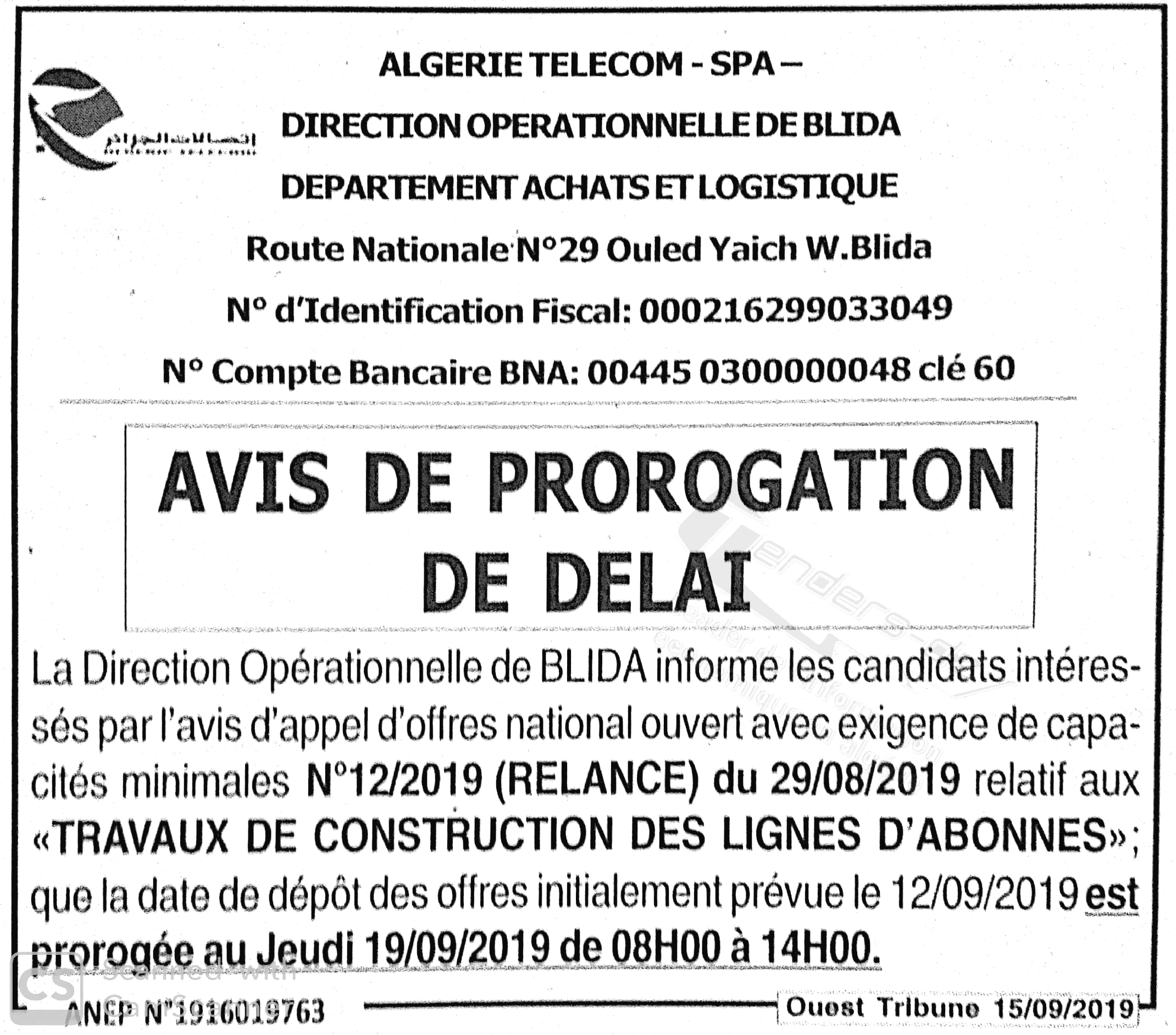 Nom Organisme : ALGERIE TELECOM/ DO WILAYA DE BLIDA (DIRECTION OPERATIONNELLE)