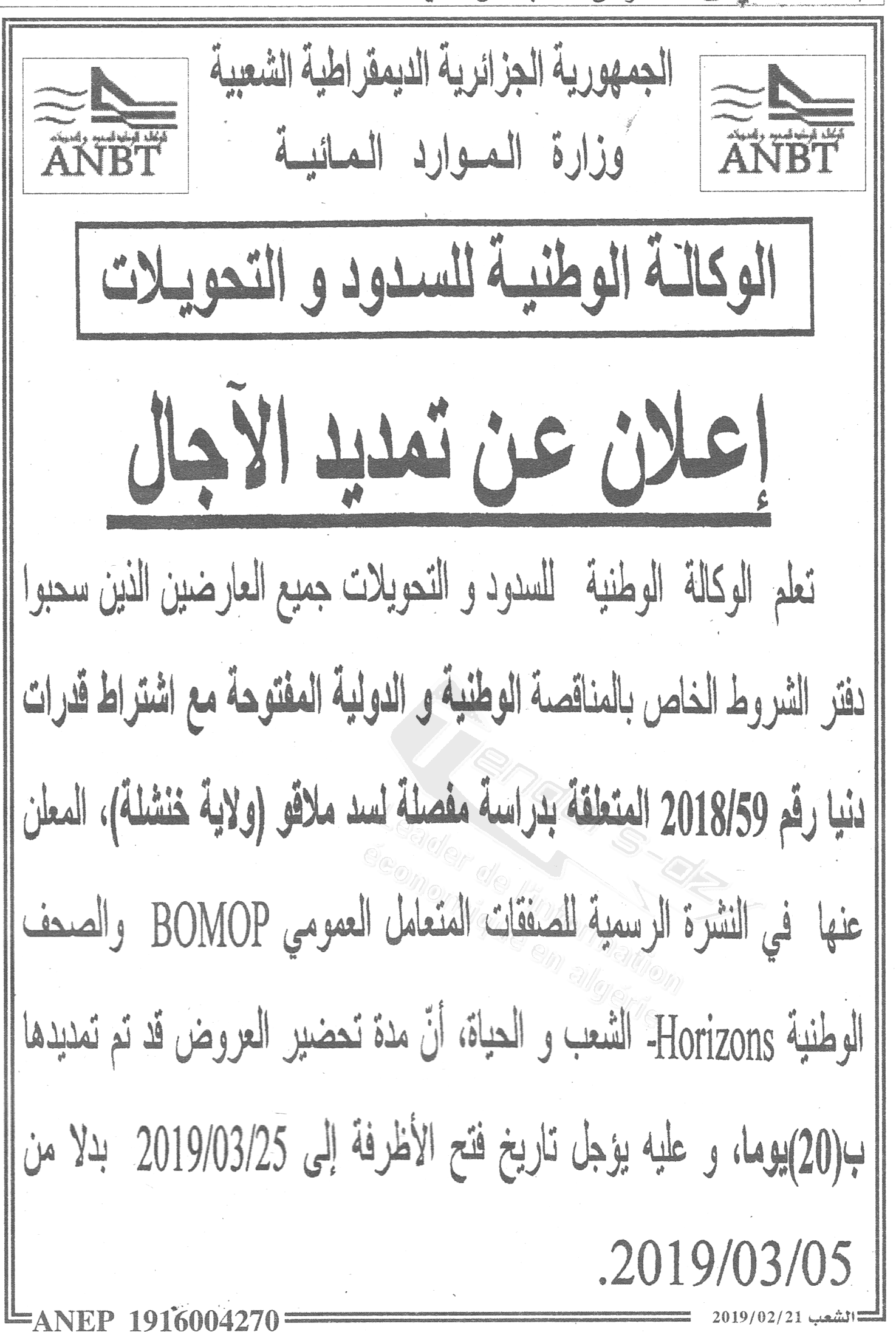 Nom Organisme : ANBT (AGENCE NATIONALE DES BARRAGES ET TRANSFERTS)