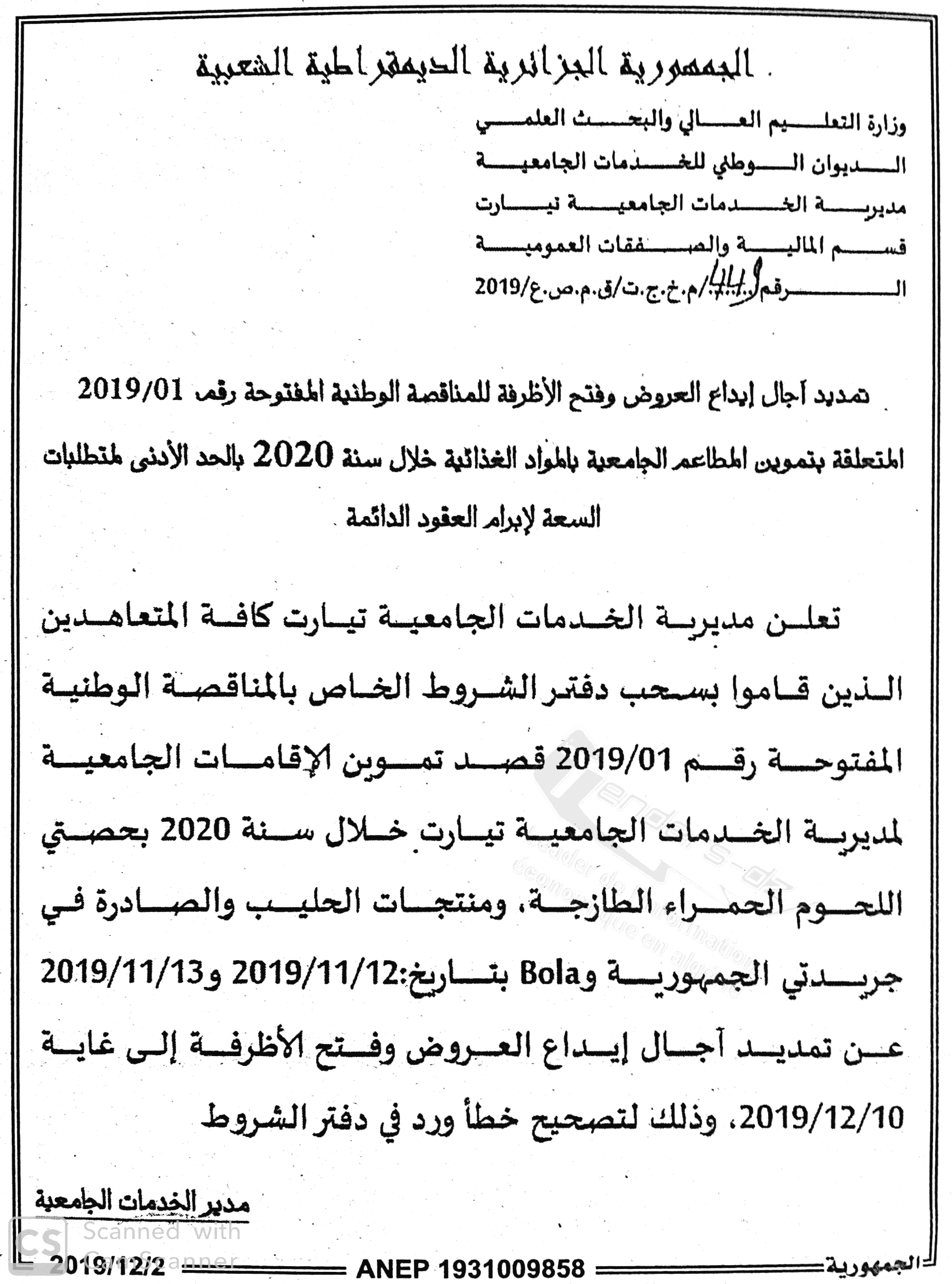 Objet : Approvisionnement en denrées alimentaires au profit des résidences universitaires