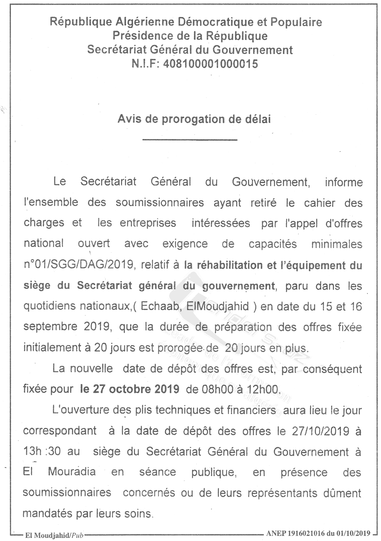 Objet : Réhabilitation et équipement du siège du secrétariat général du gouvernement au niveau du siège à El Mouradia en 03 lots