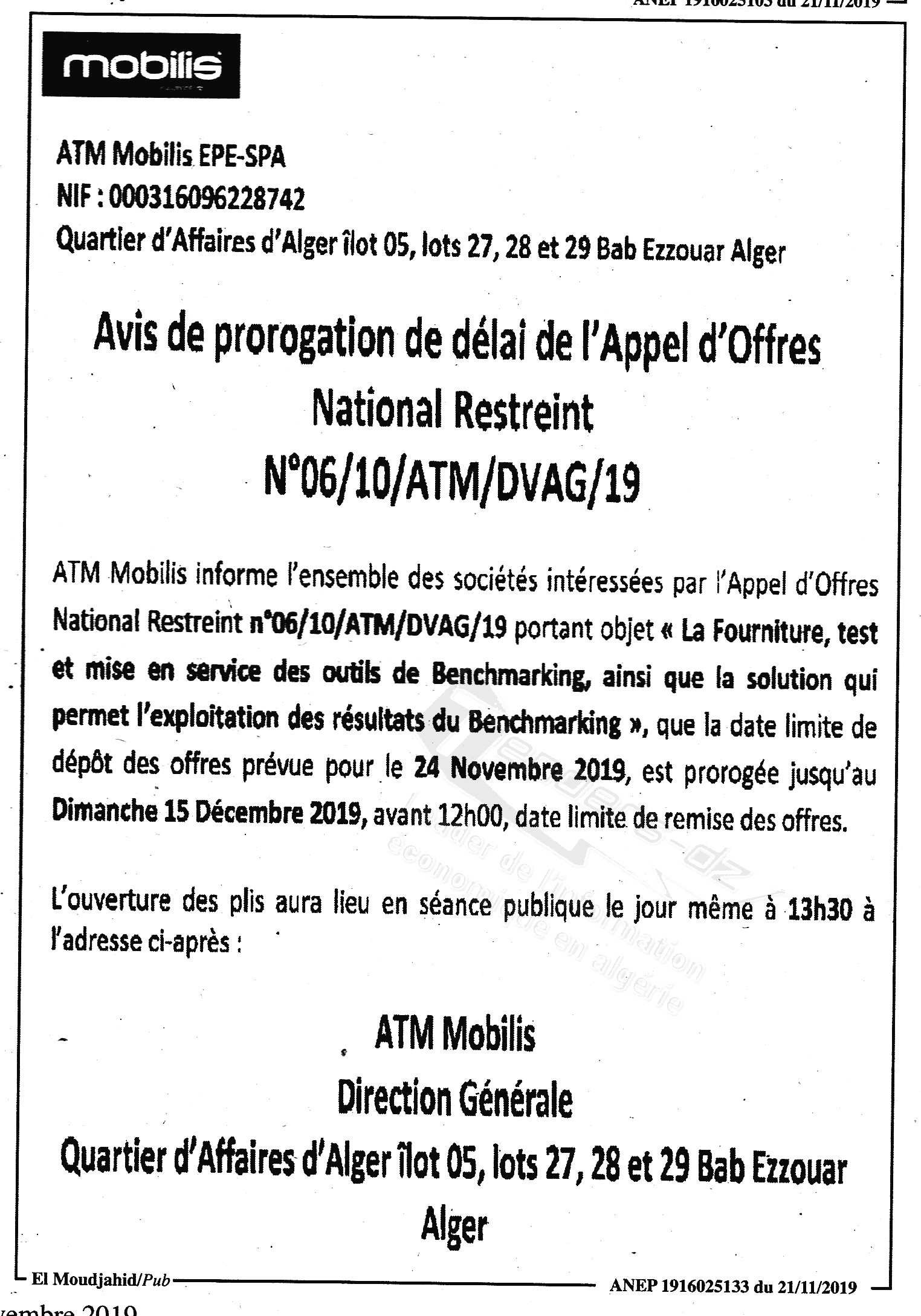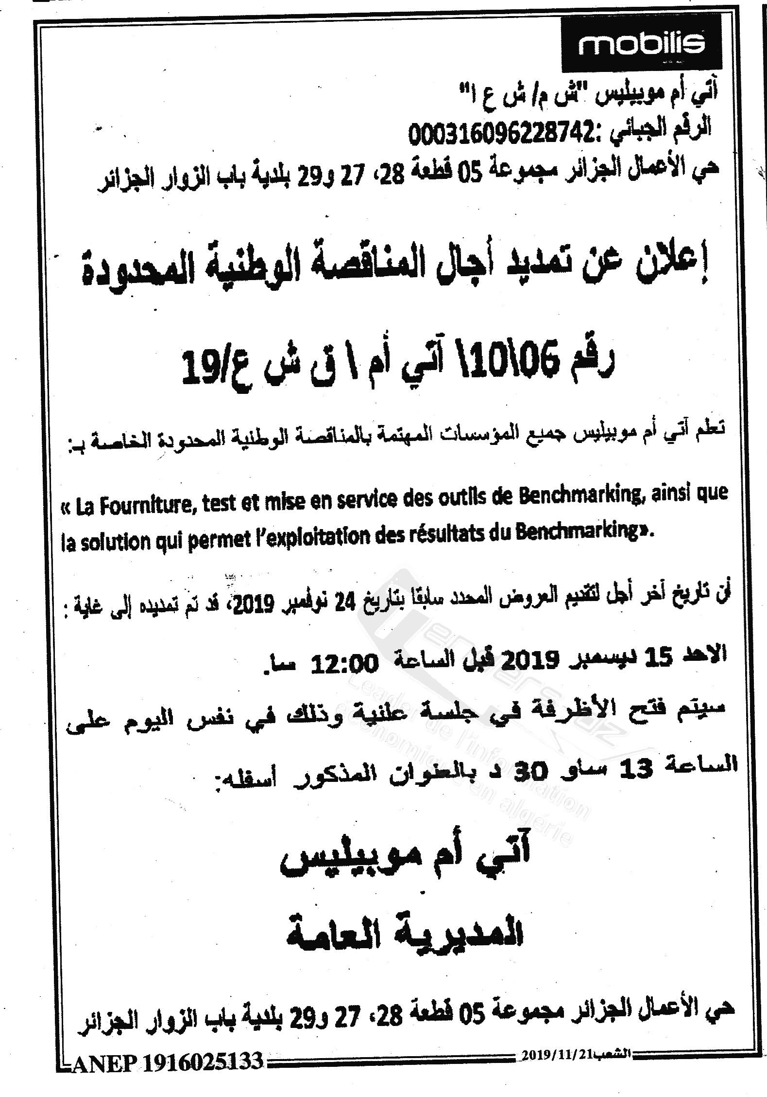 Objet : Fourniture , test en mise en service des outils de Benchmarking ainsi que la solution qui permet l'exploitation des résultat du Benchmaridng