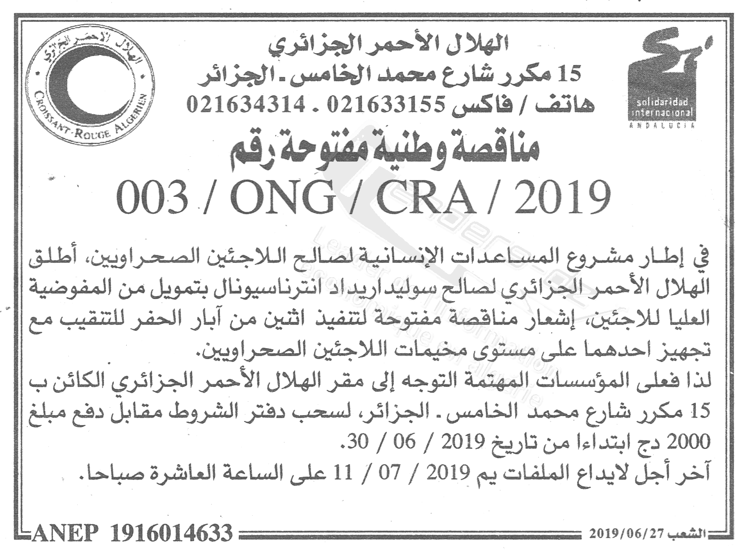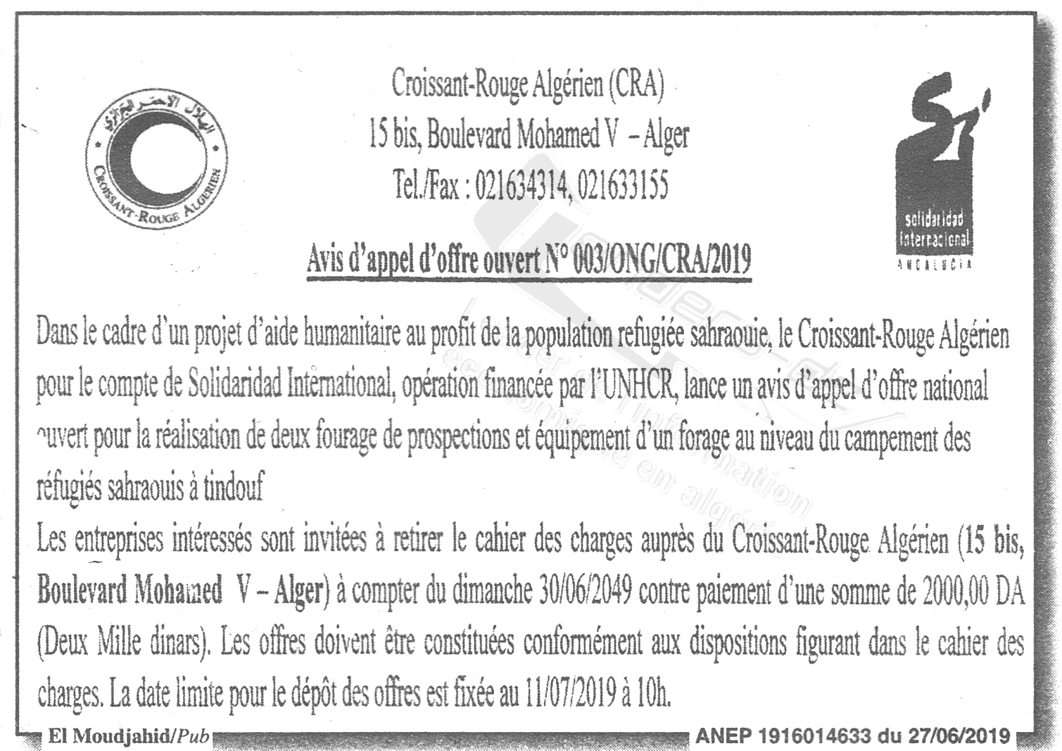 Objet : Réalisation de deux forage de prospections et équipement d'un forage au niveau du campement des réfugiés sahraouis à Tindouf
